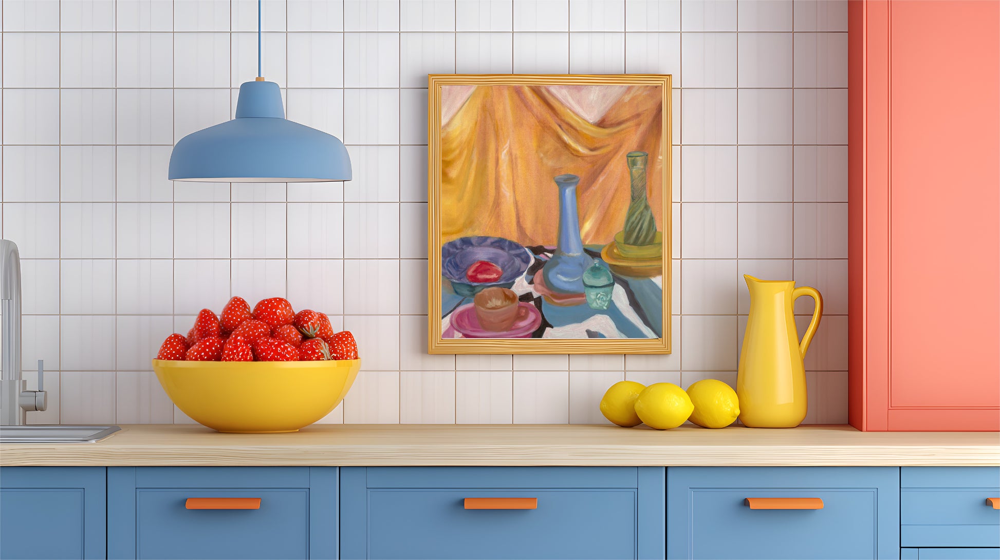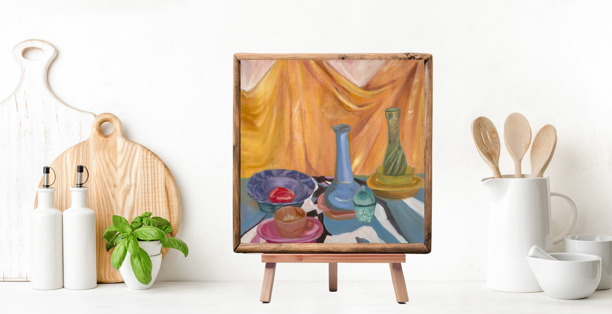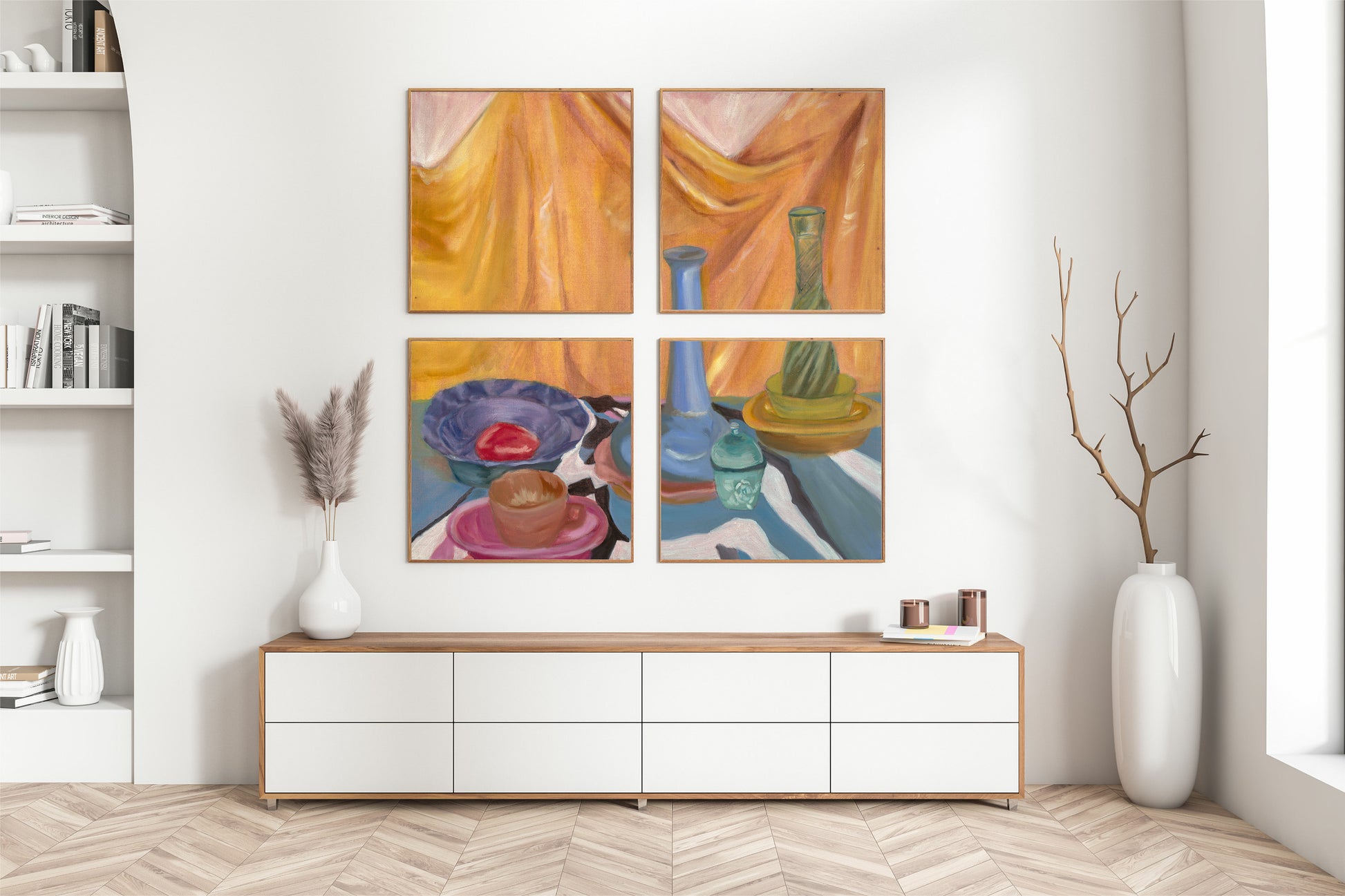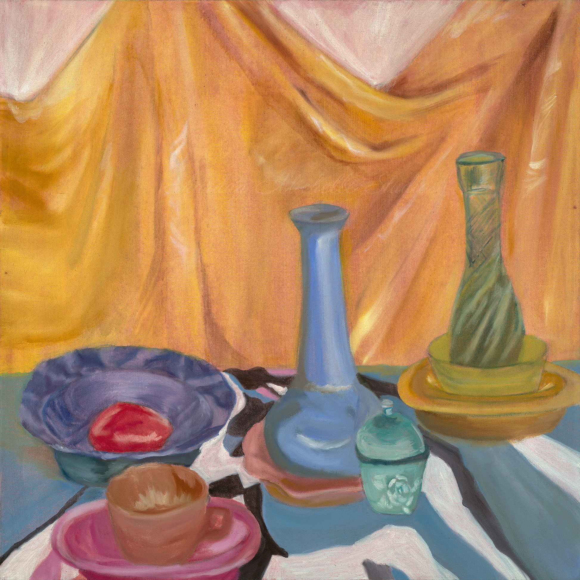 An assortment of glass objects in a still life setting, composed of a saturation of different hues. The background featuring a draped cloth.